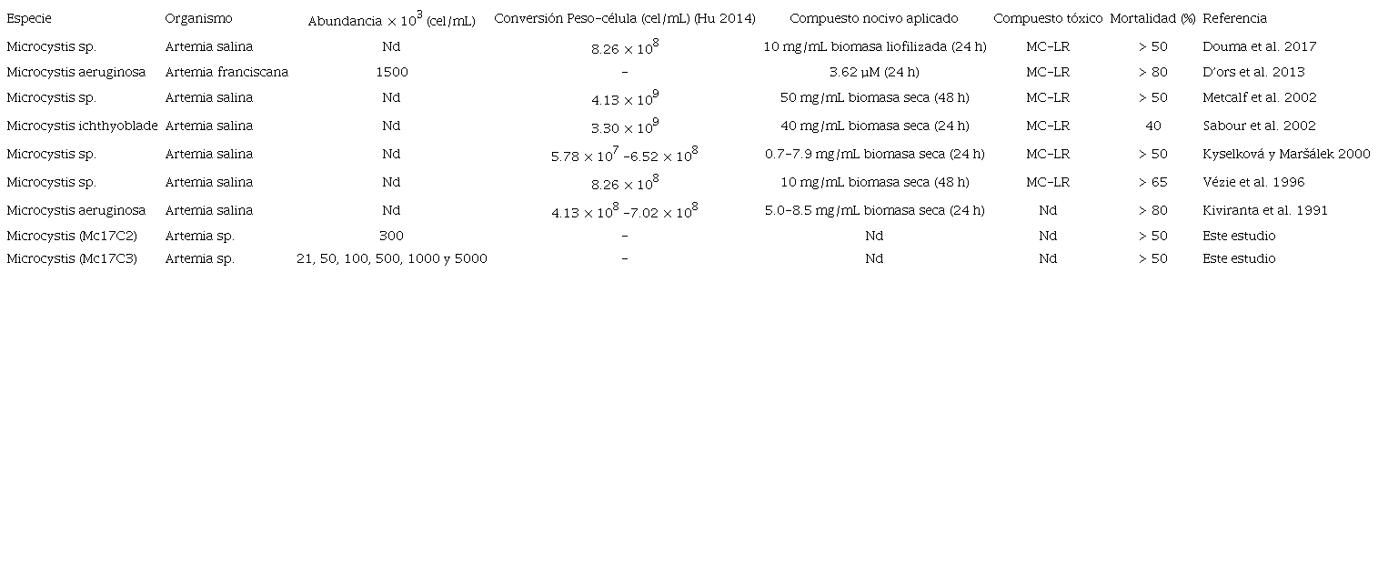 Para comparar la toxicidad de Microcystis con resultados de otros estudios, se calculó la equivalencia entre la abundancia celular (cel/mL) usada en este trabajo y la biomasa seca (mg/mL) usada por otros autores, considerando que una célula tuvo una equivalencia en peso de 1.21 × 10-11 g (Hu 2014).