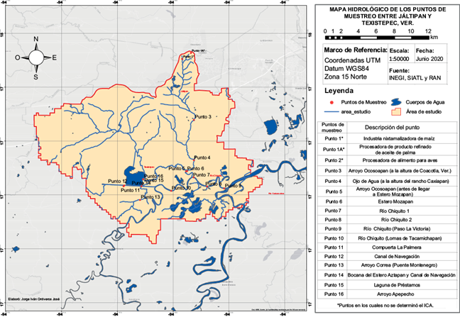 Los puntos 3 y 5 fueron ubicados en el arroyo Ocosoapan, en tanto que los puntos 4 y 6 corresponden a Ojo de Agua y al estero Mozapan, respectivamente. Los puntos 7, 8, 9 y 10 se encuentran sobre el río Chiquito. El punto 11 corresponde a un canal que recibe escorrentías agrícolas de una zona de cultivo de palma de aceite (conocido como Compuerta La Palmera), el cual descarga hacia el Canal de Navegación (punto 12), contiguo a la presa Agua de Minas. El punto 13 está ubicado sobre el arroyo Correa a la altura del puente Monte Negro y confluye en el punto 14. El punto 14 se ubica en la confluencia de las corrientes del estero Mozapan, del Canal de Navegación, arroyo Correa y Laguna de Préstamos, el cual se identifica como bocana del Estero Aztapan y Canal de Navegación. El punto 15 corresponde a un cuerpo de agua conocido como Laguna de Préstamos, ubicado al sureste de la presa Agua de Minas y conectado con el punto 14. Finalmente, el punto 16 se ubica en el arroyo Apepecho, afluente del estero Aztapan y adyacente a la presa Agua de Minas.