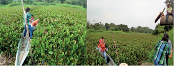 En el punto 3 se percibió un ligero olor a descargas sanitarias y se observó la escorrentía de un potrero adyacente. Esta última situación fue notoria también en el punto 4. En los puntos de muestreo 5 al 9 sólo se observó un poco de lirio acuático en las orillas de los cauces de agua, y no se registró la presencia de otro factor indicativo de contaminación. En la zona comprendida de los puntos 10 al 16 se observó gran cantidad de lirio en las orillas de los cuerpos de agua, por lo que fue difícil el acceso y se necesitó abrir paso a las canoas con remos y manos. Asimismo, se encontraron botes de agroquímicos flotando en las orillas de los cuerpos superficiales y algunos entre los cultivos.