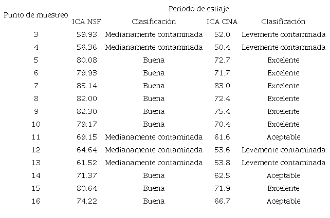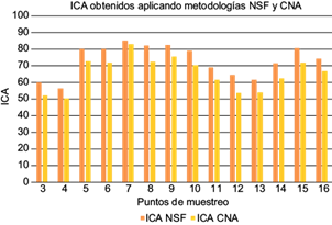 El cuadro VIII presenta los valores del ICA obtenidos en los 13 puntos de muestreo aplicando las metodologías del NSF y la CNA. Se incluye también la categorización de la calidad de acuerdo con cada metodología.