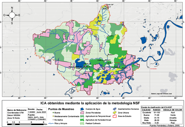 La figura 3 muestra la comparación de los ICA obtenidos en la campaña de muestreo mediante ambas metodologías, en tanto que las figuras 4 y 5 muestran la distribución espacial de la calidad del agua en la zona de estudio determinada mediante la aplicación de los índices NSF y CNA, respectivamente.