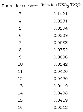 De los límites máximos recomendados por la OECD (2007), se deduce que una relación óptima DBO5/DQO es igual a 0.7, aproximadamente. Se calcularon las relaciones DBO5/DQO de los puntos 3 al 16, las cuales se muestran en el cuadro X. Se observa que la relación DBO5/DQO tuvo un valor mínimo de 0.0083 en el punto 7 y un valor máximo de 0.1421 en el punto 3. Evidentemente, todos los valores obtenidos están por debajo de la relación 0.5 (y mucho más de una relación óptima de 0.7), lo cual indica que el consumo de oxígeno en el cuerpo de agua está relacionado con compuestos de difícil degradación como residuos de plaguicidas o cualquier otro tipo de residuo industrial. No obstante, debido a que la DQO no está considerada en ninguna de las metodologías aplicadas, no afecta los valores del ICA.