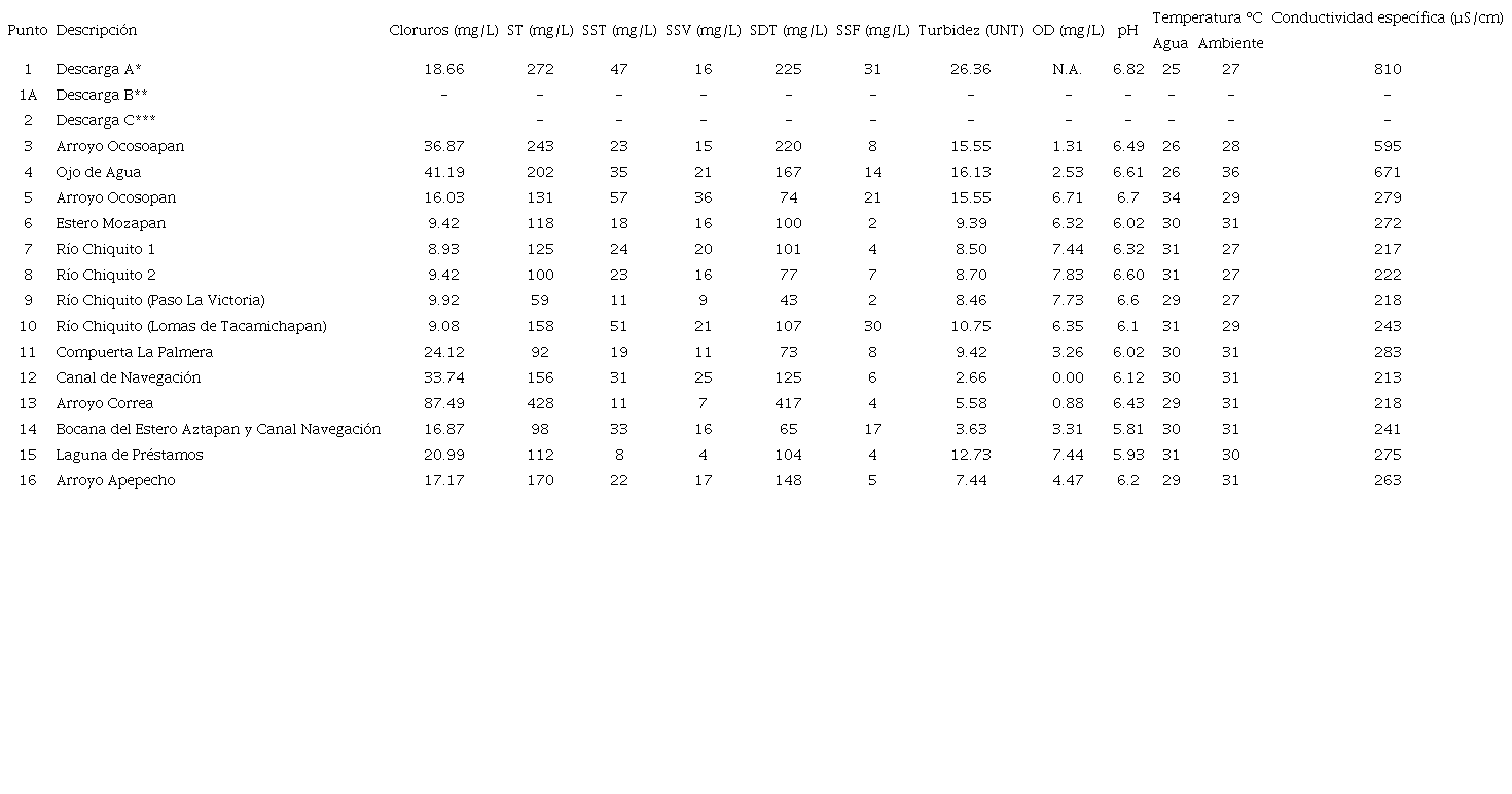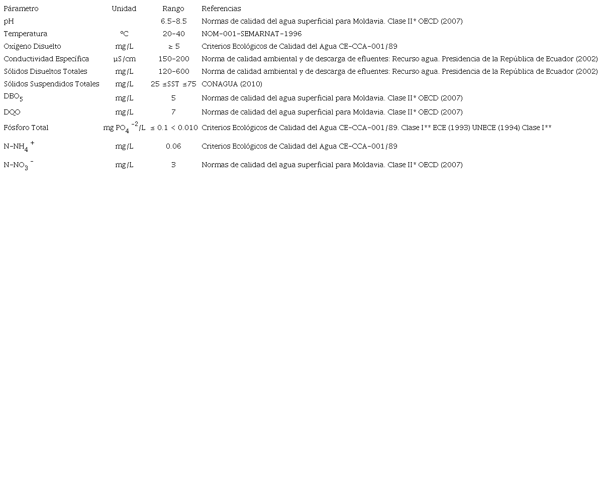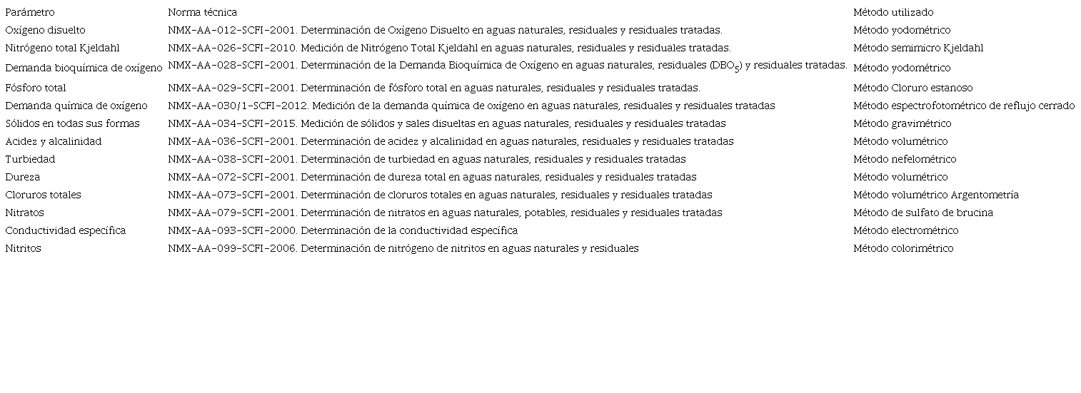 Los parámetros físicos y químicos analizados fueron: temperatura, pH, OD, conductividad específica, turbidez, sólidos en todas sus formas, cloruros, alcalinidad, dureza total, DBO5, DQO, NTK, N-NH4+, nitrógeno orgánico, N-NO2, N-NO3 y fósforo total. Para la determinación analítica de los parámetros mencionados se aplicaron las Normas Mexicanas (NMX) basadas en APHA-AWWA-WPCF (1992). Los análisis se efectuaron en el Laboratorio de Investigaciones del Medio Ambiente (LIMA) del Instituto Tecnológico de Minatitlán, utilizando los métodos mostrados en el cuadro II.