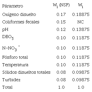 Para calcular el ICA-NSF se usa una suma lineal ponderada de los subíndices (ICAa, promedio aritmético ponderado, ecuación 1) o una función de agregación del producto ponderado (ICAm, función ponderada multiplicativa, ecuación 2), considerando los pesos asignados a cada variable, que son: OD, 0.17; coliformes fecales, 0.15; pH, 0.12; DBO5, 0.10; N-NO3, 0.10; fosfatos, 0.10; desviación de temperatura, 0.10; turbiedad, 0.08, y SDT, 0.08 (Ott 1978).