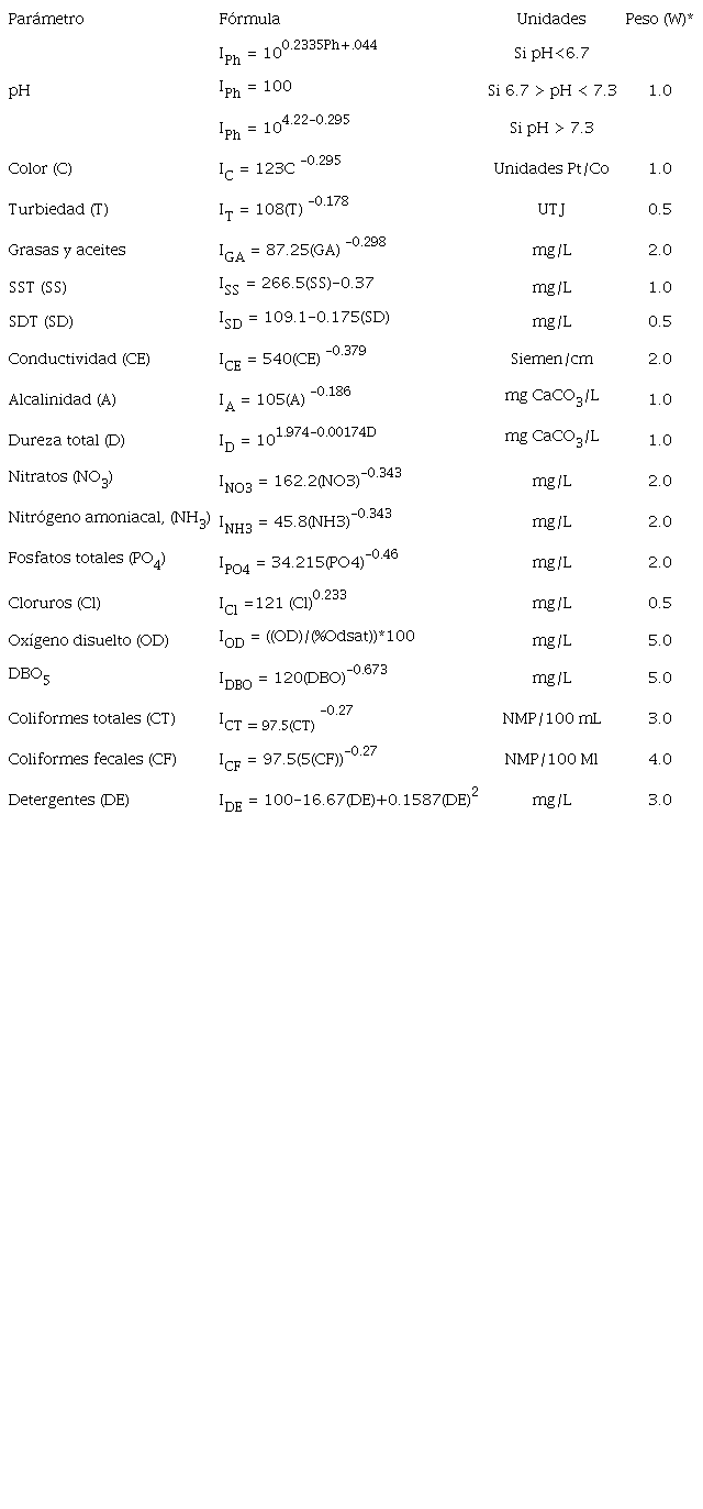 En esta investigación se consideraron en total 13 parámetros: pH, turbidez, SST, SDT, cloruros, OD, DBO5, conductividad específica, alcalinidad, dureza total, N-NH4, N-NO3 y fosfatos totales. No se consideraron los parámetros de color, grasas y aceites, coliformes totales y fecales, y sustancias activas al azul de metileno (SAAM), originalmente incluidos en el modelo de ICA-CNA, con el fin de priorizar otros indicadores de caracterización del agua para protección de la vida acuática más relevantes. Por tanto, en la ecuación 4 no se consideraron los subíndices de los parámetros eliminados ni su ponderación respectiva.