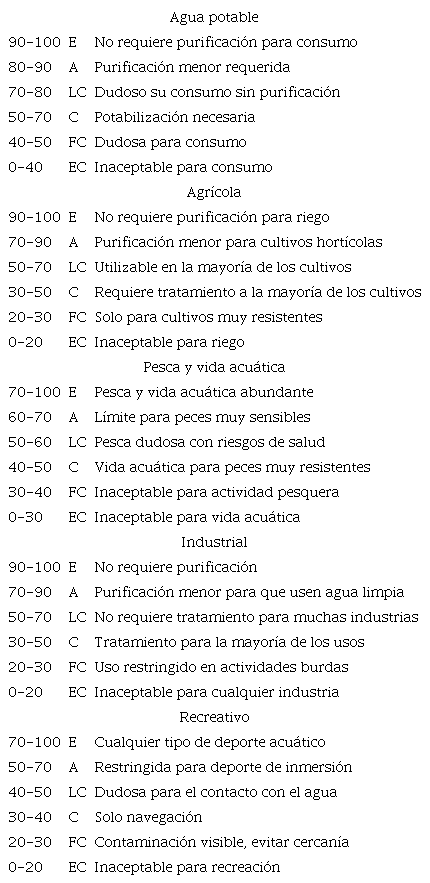 Esta metodología fue desarrollada por la Fundación Nacional de Saneamiento (NSF-National Sanitation Foundation) en Estados Unidos (Brown et al. 1970) y mejorada por Deininger para la Academia Nacional de Ciencias de Estados Unidos (NAS 1975).