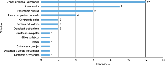 En el contexto latinoamericano y luego del análisis de los cuerpos legales referidos, se obtuvieron 36 criterios mínimos a cumplir para la ubicación óptima de un sitio de disposición final, detallados en el cuadro II. Los criterios han sido clasificados en cuatro categorías que son: social, técnica, económica y ambiental. El 36 % corresponde a la categoría social, el 28 % a la técnica, el 25 % a la económica y el 11 % a la ambiental. A simple vista, el componente social lideraría la selección de un sitio para un RS. Sin embargo, de acuerdo con el análisis de frecuencias (Fig. 1), se observa que de los criterios dentro de esta categoría, el 69 % se contemplan en máximo dos países, y tan sólo el 31 % restante, constituido por cuatro criterios básicos, son contemplados en más países. De estos cuatro criterios, el primero, referenciado en el 86 % de las normas, corresponde a la evaluación de las distancias a zonas urbanas y de expansión, por los riesgos que implica en la salud pública (Ogunrinola y Adepegba 2012, Palmeira-Wanderley et al. 2017). El segundo, considerado en el 64 % de las normas corresponde a la distancia a aeropuertos por el peligro que puede representar para un avión, ya sea por una explosión (Abd-El Monsef y Smith 2019) u obstáculos aéreos que pongan en riesgo los procesos de vuelo (Dar et al. 2019). El tercero, se refiere a la conservación de zonas de patrimonio cultural, que se encuentra en el 43 % de las normas. Finalmente, el cuarto criterio, de uso y ocupación del suelo, se presenta en el 29 % de las normas. Este tiene como objetivo proteger a los ecosistemas altamente amenazados por la contaminación que generan los residuos sólidos y la incorrecta ubicación de un RS, criterio que se encuentra supeditado a la estructura de conservación propia de cada país.