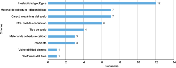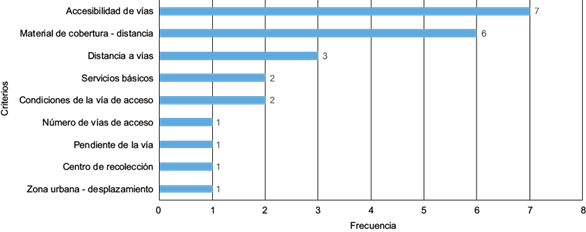 Por último, el aspecto económico apunta a la sostenibilidad del sistema, en donde se resalta el alto costo que significa el traslado de los residuos sólidos desde las urbes hasta el sitio de disposición final (Gascón et al. 2015), y su posterior cobertura con material idóneo. Según el análisis de frecuencia (Fig. 4), la importancia recae sobre dos criterios: el primero, abordado en el 50 % de las normas, corresponde a la disponibilidad y accesibilidad de vías indistintamente de la época del año; y el segundo, a la distancia al material de cobertura, como la base de la operación de un RS y se encuentra en el 43 % de las normas.