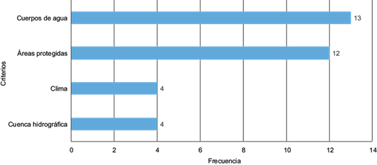 En lo que respecta a las variables ambientales y de acuerdo con la figura 3, el criterio más importante recae en la distancia a cuerpos de agua para evitar la contaminación de las fuentes superficiales y subterráneas. Este criterio está presente en un 93 % de las normas. Luego, en un 86 % de las normas se contemplan áreas protegidas para conservar zonas ecológicamente sensibles. Las menos recurrentes por estar en el 29 % de las normas son el clima y las cuencas hidrográficas. La primera, con mayor énfasis en la velocidad y dirección del viento para evitar la dispersión de malos olores propios de infraestructuras de esta índole, que, entre otros factores, tiene fuertes implicaciones en la salud pública de comunidades cercanas (Ogunrinola y Adepegba 2012), por lo que favorece al axioma social NIMBY (Salleh et al. 2017). La segunda, pretende evitar contaminación en las partes altas de las cuencas para impedir complicaciones ambientales con las poblaciones asentadas en la parte baja.