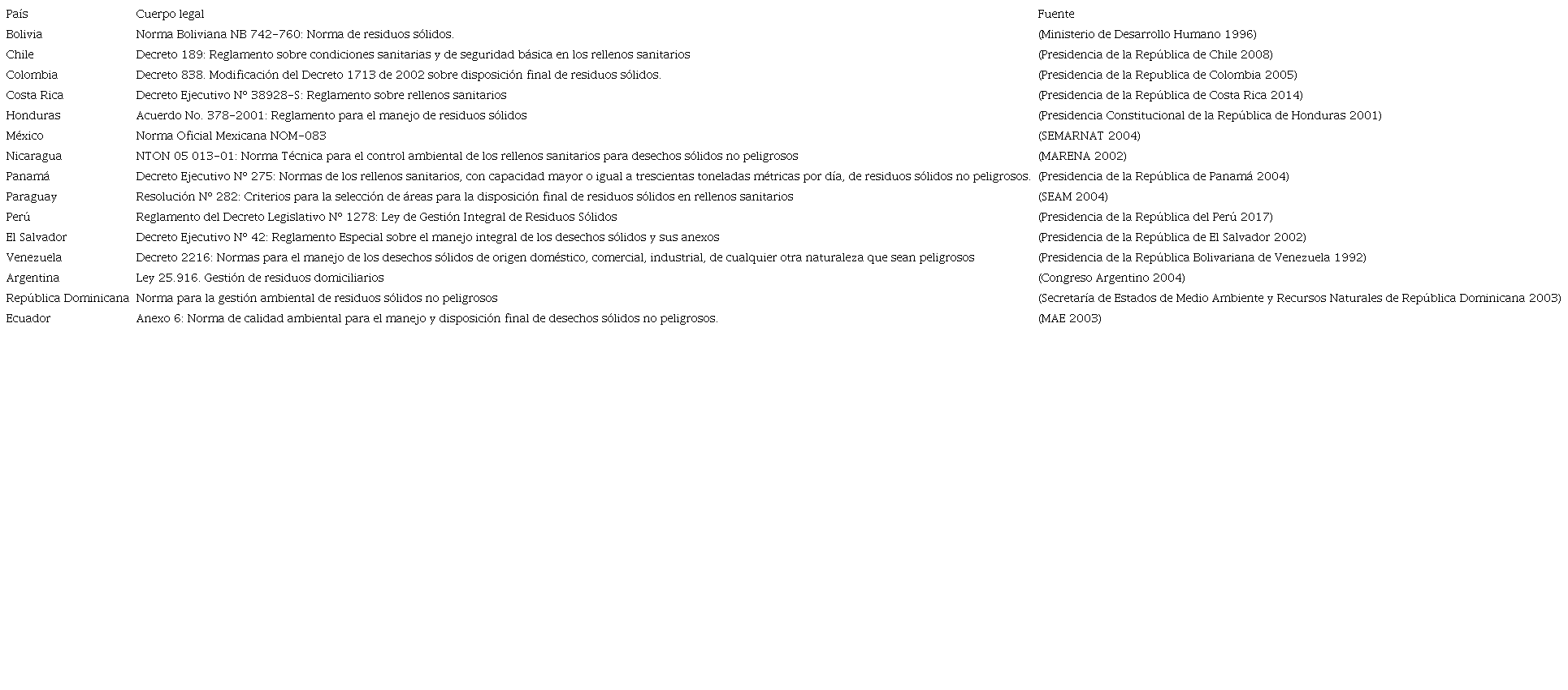 Este estudio comprendió un análisis comparativo y de frecuencia de 14 normas latinoamericanas de regulación ambiental orientadas al modelo de gestión para el manejo de residuos sólidos. En específico en el ámbito de la delimitación de un sitio para la disposición final en los países de Bolivia, Chile, Colombia, Costa Rica, Honduras, México, Nicaragua, Panamá, Paraguay, Perú, El Salvador, Venezuela, Argentina y República Dominicana, detalladas en el cuadro I. Estos cuerpos legales están vigentes hasta la fecha de ejecución de la investigación. Posteriormente, se contrastó con los criterios dispuestos en el Reglamento al Código Orgánico del Ambiente (COA) para el manejo y disposición final de desechos sólidos no peligrosos en el Ecuador, vigente desde el 12 de junio de 2019. El mencionado cuerpo legal se complementa a través del artículo 596 y sus disposiciones transitorias con el Texto Unificado de Legislación Segundaria de Medio Ambiente (TULSMA) (MAE 2015), que corresponde a una actualización del Registro Oficial Suplemento 2 de 31 de marzo de 2003, que contempla la Norma de calidad ambiental (NCA) para el manejo y disposición final de desechos sólidos no peligrosos (MAE 2003). Este último especifica los criterios mínimos a cumplir para la ubicación de un RS.