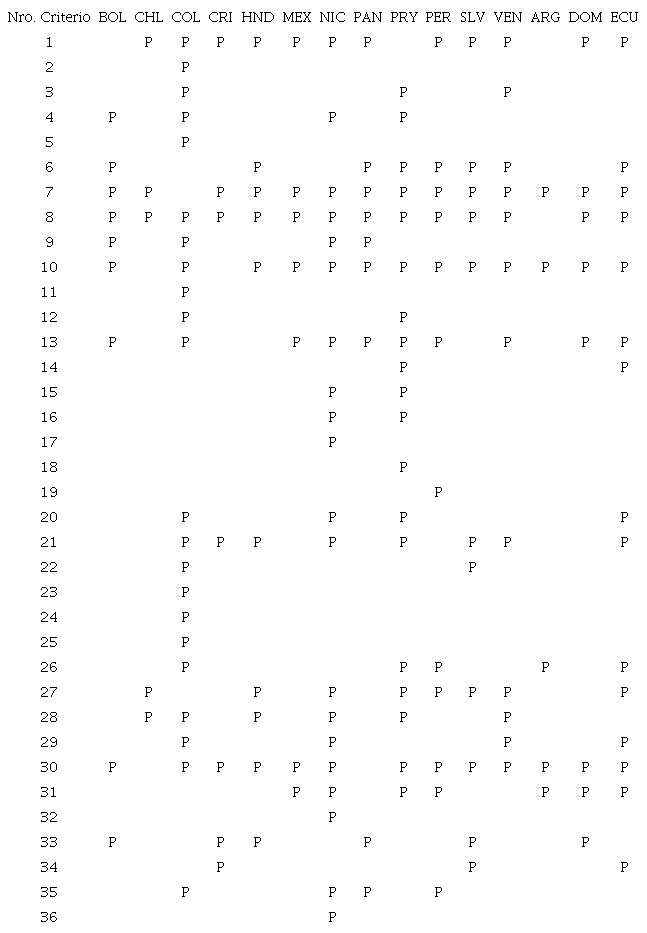 Desde otra perspectiva, las normas de Colombia, Nicaragua y Paraguay incluyen más del 50 % de los criterios analizados en el presente estudio, con 22, 20 y 19 respectivamente. Estos países incluyen variables específicas, de aplicación exclusiva en su país y representan el 33 % del total de variables analizadas. En este grupo se encuentran el 46 % de las variables sociales (6 de 13), el 44 % de las económicas (4 de 9), un 20 % de las técnicas y ninguna ambiental.