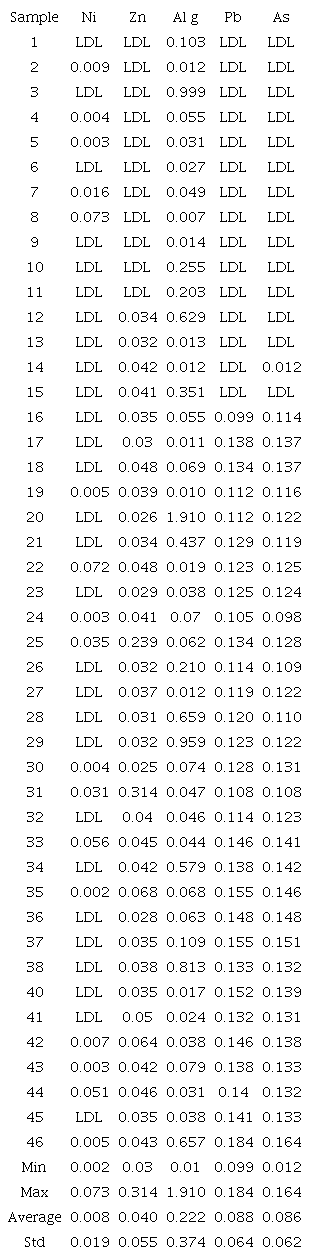 The measurements were performed using a Genesis ICP optical emission spectrometer (Spectro Analytical Instruments, Kleve, Germany) with axial plasma observation. The instrument includes a Paschen-Runge mount spectrometer, constructed employing the optimized Rowland circle alignment (ORCA) technique. It consists of two hollow section cast shells, designed for direct thermal stabilization and small volume. 15 pre-aligned linear CCD detectors are installed on the outside of the optics body, which allow fast, simultaneous spectrum capture of the wavelength range between 175 nm and 777 nm. For UV access (< 200 nm), the optical system was purged with argon. The purge rate during normal operation is 0.5 L/min. To enable the method, intelligent calibration logic (ICAL) transfer between individual instruments, was used to normalize the wavelength and the intensity scale of the optical system to a reference optic (“optic master”). Stability of the forward power in the case of rapidly changing sample loads was achieved through the use of an air-cooled ICP-generator, based on a free running 27.12 MHz system. All ICP operating parameters were software controlled. The ICP-OES instrument was initialized and allowed to achieve thermal equilibrium over 30 min. ICP-OES determinations of elements concentration were performed using the emission lines 228.802, 267.716, 324.752, 238.204, 285.213, 259.372, 231.604, 220.353, 213.857, 189.641, 196.090, 384.401 and 311.071 λ (nm) for the elements Cd, Cr, Cu, Fe, Mn, Ni, Pb, Zn, As and Al respectively.
