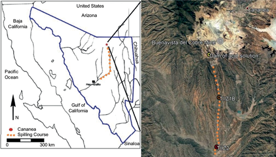 In September 2014, a leak from a dam containing a solution of sulfuric acid occurred in a mine near Cananea, Sonora, northwestern Mexico, affecting the hydrological basin of the Sonora River (Fig. 1). Lixiviation and electro-gain in acid solution is a common hydrometallurgy method used by mining companies to extract copper from a copper porphyry. After the spilling incident, the company tried to remediate and mitigate the impact by neutralizing the solution using lime and by recollecting manually (with shovels) the spilled material from the fluvial sediments in the riverbank.