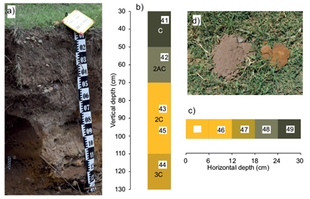 The samples of the material to evaluate were taken from the profile named TIIZ1B (UTM coordinates: X: 0563986, Y: 3415429), which consists of a 130 cm thick profile, formed by five horizons (AC, C, 2AC, C and 3C) with poorly developed pedogenic features (Fig. 2). A sharp color change was visible in this profile. While the upper part exhibited a dark brownish color (10YR2/2-10YR2.5/2, according to the Munsell scale), the lower part, from 70 to 124 cm, presented a yellowish pigmentation (10Yr3/3-10YR3/6, Munsell scale) (Romero-Lázaro et al. 2019). This suggests that the lower part was affected by the acid solution leak (based on the presence of yellowish precipitates), while the upper part was not affected (based on the lack of yellow precipitates). In order to detect the extension in which the lower part was affected, a horizontal profile was dug from the surface to 34 cm of depth inside the 2C horizon, at 90 cm from the top. During this procedure, it was observed that the yellow pigmentation was superficial in the horizon and disappeared at 24 cm of depth (Fig. 2). A total of five samples were taken from the TIIZ1B vertical profile, one for each horizon, and five more from the TIZ1B horizontal profile, one each 6 cm.