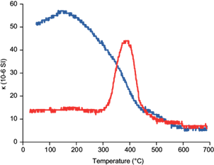 During heating, the bulk magnetic susceptibility of samples from the acid solution precipitates showed a strong increase around 280 ºC (Fig. 3, red line), reaching a maximum four-fold increase of the initial κ at around 380 ºC, and then quickly decreasing between 400 and 500 ºC. During this decreasing process, a change in the curve slope is observed around 450 ºC. Another small susceptibility drop is observed near 600 ºC. During cooling (Fig. 3, blue line) the susceptibility increases, reaching its maximum at 150 ºC, which is five times the initial value.