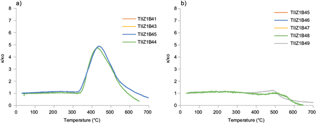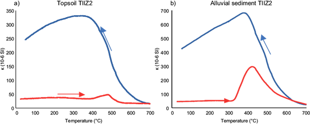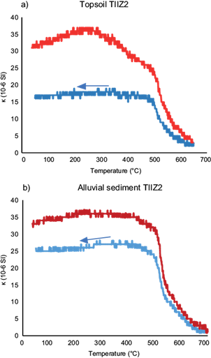 The samples from TIIZ1B vertical and horizontal profiles exhibit clear differences depending on their location within the profile. In the vertical profile, samples from the lower part, which have visible signs of being affected (yellowish pigments), present a sudden strong raise of κ values during heating at around 330 ºC, reaching a maximum value around 430 ºC, and a quick decrease of susceptibility around 500 ºC (Fig. 5b). This behavior indicates that a transformation of a weak magnetic mineral into a strong magnetic mineral occurs. On the other hand, samples from the non-affected part do not show such behavior. Non-affected samples initially exhibit a small increase due to the unblocking of SP magnetite particles, and a strong loss of magnetic susceptibility around 550 ºC (Fig. 5a), which indicates that magnetic behavior of non-affected samples is dominated by magnetite. During cooling, both samples exhibit a similar tendency, that is a strong increase in κ values, reaching a maximum at around 400 ºC. It is remarkable that the magnetic susceptibility of the affected sample is twice the value of the non-affected one after heating and cooling cycle at room temperature, while κ values of both materials are very similar before heating.