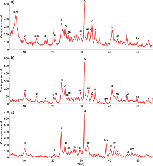 The diffractogram of the TIIZ1B43 sample (affected) show a mineralogy basically constituted by silicate minerals, but the presence of jarosite is not detected by the XRD measurement (Fig. 8a), which could be due to a low concentration and/or crystallinity of this mineral. Very similar mineralogy is observed in diffractograms of non-affected samples (Fig. 8b).