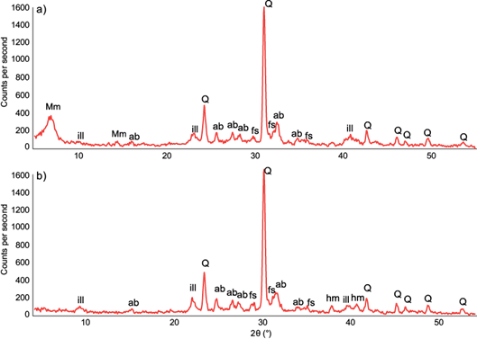 To assess the mineralogy of the materials, samples were milled, sieved with a 150 greed and analyzed with a portable Olympus Terra X-ray diffractometer, in an angular range from 5º to 55º, with a scanning of 50 exposures of a Co radiation source. Analysis of data and identification of mineral phases was made with the XPowder software 2010.01.35 PRO and the PDF2 data basis.