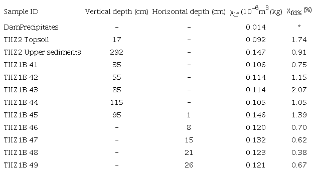 The results from χlf and χfd% measurements are shown in Table I. The lowest χlf value is from the dam precipitates sample, which is an order lower than the rest of the samples collection. The highest value is exhibited by the non-affected alluvial sediments of the TIIZ2 profile, which presents a very low χfd% value. On the other side, the topsoil has a lower χlf than the alluvial sediment, but a higher χfd% . In the TIIZ1B profile we can observe that χlf values are similar along the vertical and horizontal profiles: vertically, there is a slight increase downwards, reaching a maximum in the 45 sample; horizontally, the maximum is reached on the surface. In this profile, χlf values are low in general, but a slight increase can be noticed around samples 43 and 45.