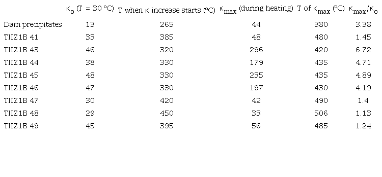 It is reported that jarosite presents different reactions during heating, at different temperatures, depending on cation content. Thermogravimetrical studies of this mineral have reported that a series of mass losses are observed during heating, the fist at 130 ºC due to dehydroxylation, and others at 330, 500 and 620 ºC due to desulphation (Frost et al. 2005). The second mass loss coincides with the temperature at which κ starts increasing in our samples. Then, if iron has been desulphated in presence of an oxygen atmosphere, the formation of iron oxides occurs, which explains the rise of κ values.