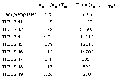 Table III shows a comparison between the alteration index proposed in this paper and the one from by Abrajevitch and Kodama (2011), which is calculated with saturation magnetization data, but it is also possible to calculate it with κ data. It consists of approximating the area under the κ vs T plot (which corresponds to κ increase due to the mineral transformation) by means of a triangle with base of 2(Tmax - T0) and height of (κmax − κo). The comparison shows that trends for both indices coincide, and samples with a higher value of the κmax/κo ratio also present a greater area under the alteration peak.
