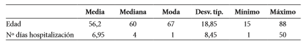 El perfil de los usuarios del servicio de medicina adulto encuestados se caracteriza por una media de edad de 56,2 años, con una mediana de 60 años, un promedio de 6,95 días de hospitalización, con una mediana de 4 días. El mínimo de días de hospitalización fue de 1 y el máximo de días de hospitalización fue de 50 días (Tabla 1).