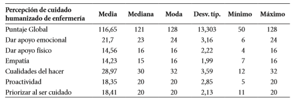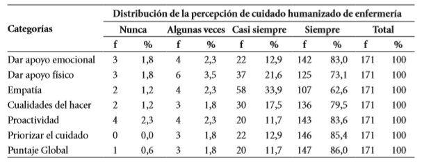 Respecto a la percepción de cuidado humanizado, los resultados muestran que el promedio del puntaje global obtenido fue de 116,65 pts., es decir siempre se percibe cuidado humanizado. El puntaje mínimo obtenido fue 50 pts., correspondiente a la categoría nunca se percibe cuidado humanizado. De acuerdo con la percepción de cuidado humanizado por categorías, la distribución de las medias mostró que todas las categorías son percibidas como siempre (Tabla 2).