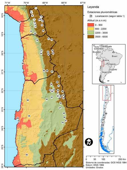 El Norte Grande de Chile se ubica en los Andes Centrales, región que comprende a la zona andina de Perú, Bolivia, Argentina y Chile. Se sitúa entre las latitudes ~18 °S y ~27 °S. Se caracteriza según Latorreet al. (2005) por la existencia de un desierto costero (0-900 metros de altitud), la Depresión Intermedia (900-2200 metros de altitud), la precordillera (22003500 metros de altitud) y las mesetas semiáridas sobre los 3500 m de altitud, que en su conjunto forman lo que se denomina “Puna” o “Altiplano” (Jaksic et al. 1997). Administrativamente, corresponde a las regiones XV de Arica y Parinacota, I de Tarapacá y II de Antofagasta (Figura 1).