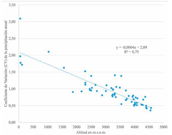 Como se ha señalado anteriormente, la precipitación anual media fluctúa considerablemente en el área de estudio, variando entre 0,59 mm en Iquique (costa) y 394,79 mm en Cotacotani (altiplano andino; Tabla 2). Destaca la alta correlación entre la cantidad de lluvias medias anuales y su distribución zonal y altitudinal, con valores de Pearson de -0,71 y +0,71 (p<0,01) en ambos casos. El Coeficiente de Variación y la altitud se relacionan mejor (r = 0,87), diferenciando la costa (alta variabilidad) del Altiplano (moderada variabilidad), lo que se aprecia en la Figura 2.