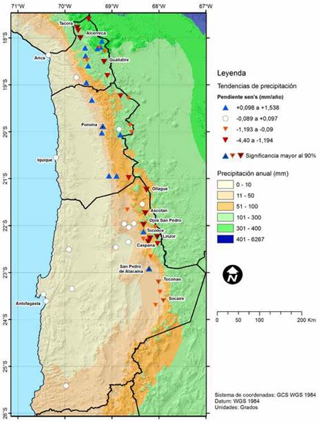Geográficamente, la Figura 3 muestra que estaciones meteorológicas costeras y localizadas en la Depresión intermedia no manifiestan ninguna tendencia de cambio, mientras que las de precordillera y Altiplano exhiben tendencias generales a la reducción de la precipitación, con la excepción de Parinacota, en el Altiplano de Arica. Considerando las tendencias significativas, en el Altiplano se registran descensos de la precipitación, y aumentos para la precordillera de Tarapacá y Antofagasta.
