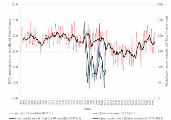 Los cortos y escasos registros de estaciones meteorológicas de los que se dispone en el Norte Grande dificultan el establecimiento de tendencias claras durante el siglo XX, referidas a aumentos o disminuciones interanuales de las temperaturas y de las precipitaciones. Estas últimas reflejan una alta irregularidad con alzas y disminuciones asociadas a patrones de teleconexiones (la más influyente, el ENSO). No obstante, al decir de Sarricolea y Romero (2015), los modelos climáticos globales (GCM) y regionales (RCM) construidos bajo los escenarios de emisiones de gases de efecto invernadero y variabilidad natural, señalan tendencias de aumentos significativos de las temperaturas, y escasos niveles de confianza sobre las tendencias de las precipitaciones de fines del siglo XXI (Fuenzalida et al., 2007), pese a que en Minvielle y Garreaud (2011) se menciona un debilitamiento de los flujos desde la cuenca amazónica, y por tanto, una disminución de la precipitación altiplánica, lo que es consistente con los resultados publicados por el Quinto Informe de Evaluación (AR5) del IPCC (2013: 1264).