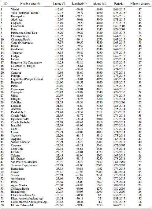 Se utilizan para este estudio los datos pluvio-métricos de sesenta estaciones meteorológicas, pertenecientes, en su mayoría (54 estaciones), a la Dirección General de Aguas (DGA), y seis que corresponden a la Dirección Meteorológica de Chile (DMC) (Tabla 1). Los datos mensuales fueron obtenidos desde el repositorio del Centro de Ciencia del Clima y la Resiliencia ((CR)2) de la Universidad de Chile, siendo revisados para evitar problemas relativos a la existencia de lagunas y respecto de su continuidad temporal. La longitud media de las series es de cuarenta años, cuyo período de registro de mayor continuidad abarca desde 1972 a 2013.