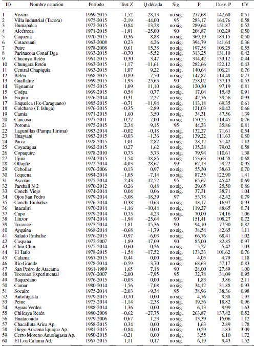 Respecto de las tendencias, se observa que, de las sesenta estaciones meteorológicas analizadas, solo en trece resultan significativas al 90%, y, de ellas, solo siete al 95% (Tabla 2). La magnitud de los cambios señala tendencias a la reducción de las precipitaciones en once de estas trece estaciones meteorológicas, con valores entre -44,0 y -7,95 mm/década. Dos estaciones ubicadas en el área de estudio, Poroma y San Pedro de Atacama, presentan tendencias significativas al alza de las precipitaciones, con 9,15 y 7,18 mm/década, respectivamente.