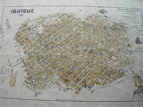 El plano de Iquique de Edward E. Muecke de 1907 (Figura 1) no registra al cementerio N° 2 y tampoco al N° 3. El cementerio N° 3 fue ubicado en una calle que dicho plano considera como sitio baldío, más allá de los límites de la ciudad. Las primeras tumbas registradas en este camposanto son de 1910, lo que explica su ausencia en el mencionado plano (El Tarapacá 1959). El cementerio N° 1 ocupa un lugar destacado demostrando su importancia para la ciudad y próximo a su muro norte debió estar el N° 2, pero no lo indica, a pesar que allí fueron enviados los obreros muertos en la más recordada masacre obrera de la historia de Chile.