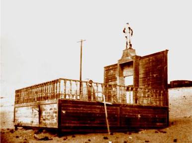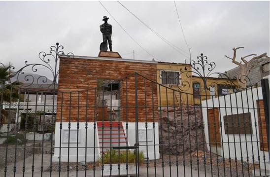 El deterioro de este cementerio fue creciente con el tiempo. Su ubicación en el margen norte de la ciudad, al costado del cementerio N° 1, fue por una parte en beneficio de su lento olvido, pero allí estaba la fosa común de los muertos de 1907 y su recuerdo era un imperativo ético para la población local y especialmente para los pampinos. Se construyó un mausoleo de madera con una estatua de un pampino (Figura 2). Símbolo necesario para todo tipo de recuerdos sociales e históricos como estos, en especial en la región de Tarapacá, que se caracteriza por simbolizar en nombres, estatuas, monolitos, o lugares específicos de las ciudades o pueblos, su historia, sus recuerdos, sus imaginarios, quedando reflejado, por ejemplo, en los patrones religiosos como la virgen del Carmen y San Lorenzo, en donde la fe, las creencias y las esperanzas más poderosas quedan cristalizadas en aquellas simbolizaciones: los pampinos muertos en 1907 no podían ser menos. La simbolización permite encuentro, permite ubicación referencial para la memoria histórica.
