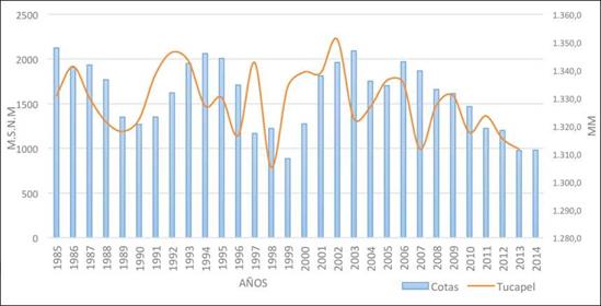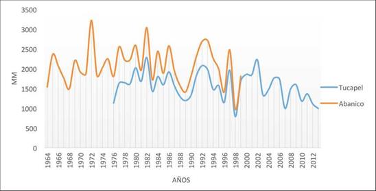 El análisis realizado permite observar en la estación Abanico una leve tendencia al descenso de precipitaciones en el período 1964-1999 (DGA 2014b), considerando que las precipitaciones para un año normal están por encima de 2.000 mm, a excepción de lo ocurrido en 1972, el que obtuvo un promedio de 3.000 mm anuales (Figura 9). El momento crítico según este registro fue 1998, con lluvias que no alcanzaron los 1.000 mm a consecuencia del fenómeno climático de El Niño detectado ese año (1998-1999) (DGA 2014c). La Estación Tucapel (DGA 2014d) mostró una tendencia marcada al descenso, presentando momentos críticos durante diversos años: en 1998 (inferior a los 800 mm en el año), en 2007 (con un poco más de 990 mm) y 2013 (con un poco más de 980 mm).