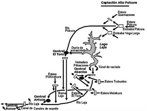El Instituto Nacional de Derechos Humanos (INDH) destaca dentro de su Mapa de Conflictos Socioambientales (2015) el conflicto del lago Laja. La Agrupación Canalistas de Laja y la Asociación de Canalistas del Laja responsabilizaron a la empresa Endesa por un uso indiscriminado del recurso hídrico en las centrales, a pesar de estar normada la utilización de este elemento en un convenio suscrito en 1958 entre la Dirección de Obras Hidráulicas (DOH) y la empresa. Durante noviembre del 2013 Endesa optó por judicializar la disputa, haciendo ingreso al Primer Juzgado de Letras de Los Ángeles una solicitud de Junta de Vigilancia para establecer y administrar los derechos de uso de cada una de las partes sin la inclusión del lago Laja5 (INDH 2015). Este acuerdo permitirá extraer 700 hm3 fijos y 200 hm3 variables, dependiendo de las condiciones hidrológicas del lago.