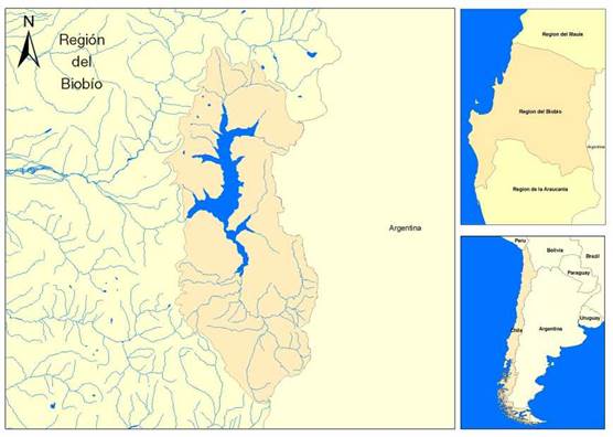 La cuenca del Laja se sitúa entre los 36° 50’-37° 40’ S y los 71° 7’-72° 45’ W, en el centro-sur de Chile (Figura 2). Esta posee una superficie aproximada de 97.000 ha, emplazando su cabecera en la cordillera Andina entre los complejos volcánicos de Antuco-Sierra Velluda -3.585 m- y Nevados de Chillán -3.212 m- (Moreno y Varela 1987; SERNAGEOMIN, Niemeyer y Muñoz 1983). El río Laja es su curso principal cuyo nacimiento se origina en el lago Laja a 1.368 m.s.n.m., transcurriendo hacia el Oeste por la depresión central y confluyendo en el río Biobío. Tiene régimen mixto (nivopluvial) y su caudal medio anual es de 170 m3 a la salida de la cordillera Andina (DGA 2014; Niemeyer y Cereceda 1984).