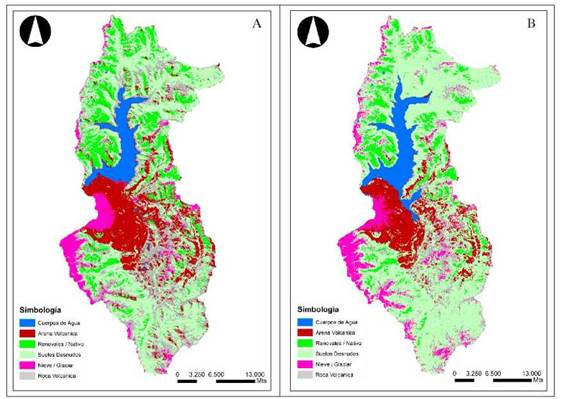El análisis de las imágenes satelitales entre 1986 y 2014 en la cabecera de la cuenca del Laja muestra que en este período de 38 años las coberturas que más se han visto modificadas son: el espejo de agua (superficie inundada), arenas volcánicas y nieve. Esta última va en directa relación con la estacionalidad al momento de realizar la clasificación de uso de suelo (verano). El lago Laja alcanzaba según los reportes de la época en 1986 una superficie de 9.130,5 ha, lo que correspondía a 9,42% de la cabecera de la cuenca del Laja (área de estudio). Para el 2014 el espejo de agua presentaba una superficie de 6.793,7 ha, es decir 7,2% de la cabecera de la cuenca. Hay una disminución de 2.336,8 ha de espejo de agua, 25,6% de disminución de la superficie inundada en 38 años.