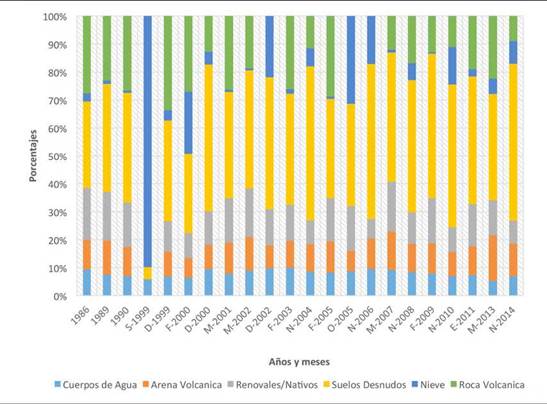 Como se muestra en las figuras 5a y 5b, la cobertura de suelos desnudos posee un promedio anual cercano a las 50.000 ha de forma estacional, ya que estas descienden en invierno ante la mayor cantidad de superficie nival. La cobertura de arenas volcánicas de 1986 mostraba una superficie de 10.163 ha que representaban 10,49% de la cabecera de la cuenca. En 2014 esta misma cobertura alcanzaba 11.139 ha con 11,49%, aproximadamente 1.000 ha mayor a la de 1986.