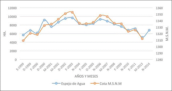 Sin embargo, existieron dos atípicos momentos en el periodo estudiado: uno en 1999 cuando el espejo de agua alcanzó a 5.666 ha, con 5,85% de la superficie de la cabecera de la cuenca y el año 2013 en que alcanzó una superficie de 5.135,6 ha, es decir, 5,3% de la cabecera.