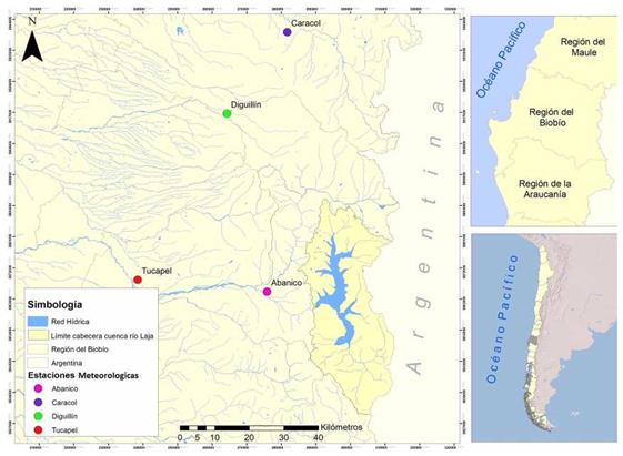En tercer lugar se analizaron las temperaturas y precipitaciones históricas en la cuenca del Laja con datos de la Dirección General de Aguas2 (DGA) en las estaciones meteorológicas más cercanas (Caracol y Diguillín) que continúan funcionado durante el período estudiado (1985-2016). Complementariamente se realizaron dos campañas de terreno en septiembre-diciembre 2014 para la constatación de los cambios y la toma de fotografías del área de estudio.