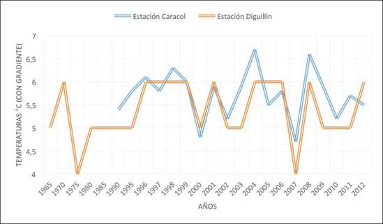 Las estaciones meteorológicas Digüillín y Caracol (Figura 8), ubicadas en la provincia del Ñuble, son las únicas cercanas y confiables para medir las temperaturas, ya que otras estaciones vistas en la región no cumplían con una continuidad en el flujo de datos o no poseían suficiente antigüedad. A estos datos se les aplicó un valor de gradiente térmico vertical de 0.65 °C por cada 100 m, profusamente descrito por la literatura como valor estándar para el descenso de temperatura en altura -para este caso 1.700 m.s.n.m- (Martínez del Castillo et al. 2010).