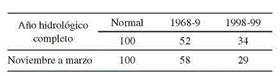 Las dimensiones de cuál puede ser el significado del anómalo año 1999 se estudian desde diferentes sectores, pero la explicación más recurrente es la grave sequía y la venta del agua equivalente a 316 GWh destinada a riego de parte del MOP (Díaz, Galetovic y Soto 2000). Según Bernstein (1999), el año hidrológico que va desde abril de 1998 a marzo de 1999 fue más seco que el de 1968-69 (considerados los más secos del siglo y bases del cálculo de precios energéticos) en términos de los caudales afluentes a las centrales del SIC. Por ejemplo, durante el año hidrológico1998-99 los afluentes del lago Laja conducían solo 65% de lo normal y 35% menos que en 1968-69 (Tabla 1).