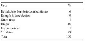 De 105 derechos entregados el año 2014 (Tabla 2), los actores predominantes son la empresa española Endesa con el uso para energía hidroeléctrica (9%) y el riego (10%), mientras que para el uso doméstico abarca el 6%, dejando en los últimos lugares al uso industrial y otros usos sin datos (78%) (DGA 2014).