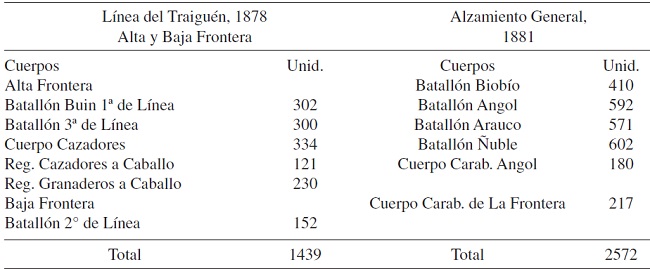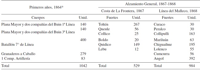 Es útil advertir que los informes de guerra no siempre informan el total del Ejército y no siempre diferencian entre el personal ocasional y el permanente, ni tampoco entregan suficiente información acerca del número de bajas de uno y otro bando, seguramente con objeto de no producir una sensación alarmista en la prensa, como la ocurrida algunos años (Bengoa 2008:221-222). La revisión de los antecedentes nos permite presentar los siguientes cuadros según etapas señaladas.