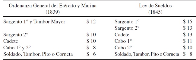 Hasta después de la Guerra la remuneración no cambió a pesar del aumento del costo de la vida13. El cabo Alderete en sus memorias nos cuenta que, por casi dos meses de servicios, en 1881 se repartió “algún dinero: a las clases de a cinco pesos y a los soldados de a tres, para comprar algunas bagatelas”. La chicha de manzana y algún otro licor barato terminaron cobrando gran parte del pago por haber puesto sus vidas en prenda (2016:83). Asimismo, una carta al Ministro de Guerra indica que en 1887 se entregaban a la tropa los mismos 10 centavos de rancho que en 1862 y “15 a los jefes de las fuerzas”14. En dicho período los sueldos y jubilaciones de los soldados no se modificaron en lo sustancial de la Ordenanza General de 1839, ni de la Ley de Sueldos, dictada pocos años después, en 1845. Bajo esas condiciones, los peones eran mejor remunerados en las minas del carbón que en el Ejército15. A pesar de ello, la sola queja o “las murmuraciones que puedan alterar el orden y la disciplina del personal”, constituían una falta a la Ordenanza que podía ser sancionada, pues, “Todo militar se manifestará siempre conforme con el sueldo que goza y empleo que ejerce” (Título XXXII, Artículo 1°).