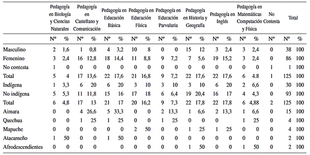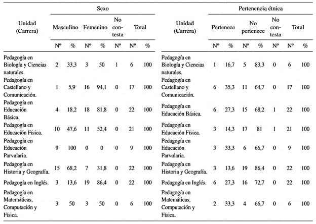 En Pedagogía en Educación Básica el 16,7% afirma pertenecer a algún grupo étnico y en el caso de Pedagogía en Castellano y Comunicación 35,3% afirma lo mismo. En Pedagogía en Educación Básica 27,3% afirma ser indígena; en la carrera de Educación Física 14,3%; y en Pedagogía en Educación Parvularia el porcentaje es de poco más del 33,3%. De forma semejante