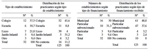 Quienes se desempeñan en establecimientos particulares subvencionados representan al 37,6% (47 casos) de los practicantes y 2,4% (3 casos) lo hacen en otro tipo de instituciones, de estas, dos son dependientes de la Junta Nacional de Jardines Infantiles (JUNJI) y la UTA dependiente del MINEDUC.