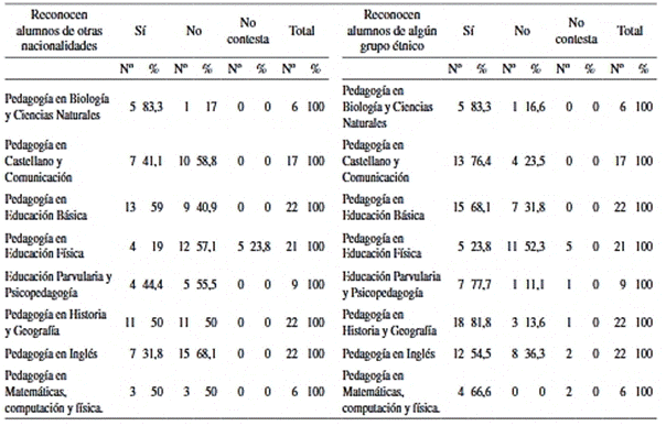 Los practicantes de Pedagogía en Biología y Ciencias Naturales, con 83,3% (5 casos), afirma tener alumnos extranjeros y 41,1% (7 casos) de los practicantes de Pedagogía en Castellano y Comunicación afirma una situación idéntica. Así mismo, los estudiantes de Pedagogía en Educación Básica manifiestan que 59% (13 casos) son alumnos de otros países, situación que se reitera en el caso de Pedagogía en Educación Básica, quienes coinciden en la afirmación, con 59% (13 casos).